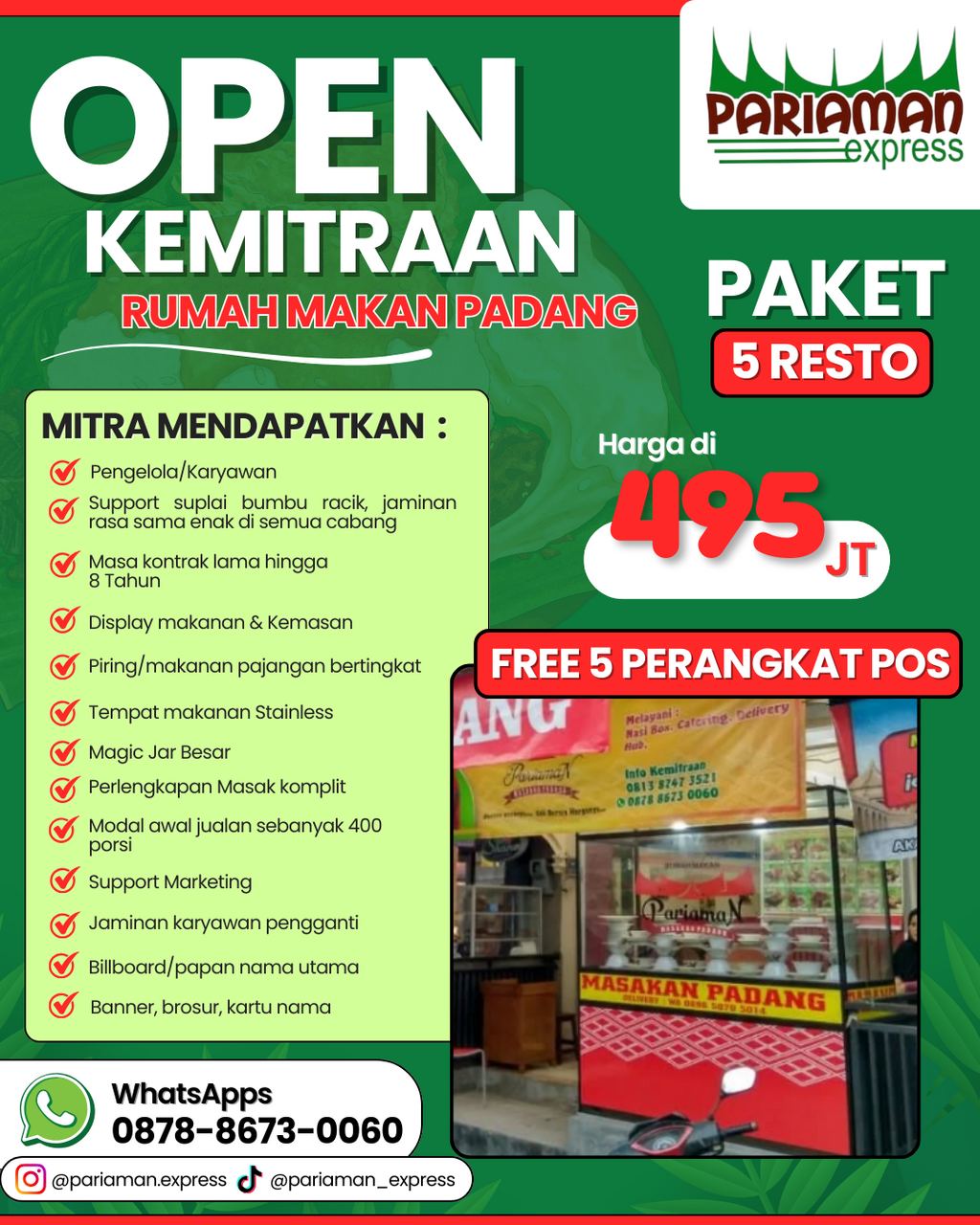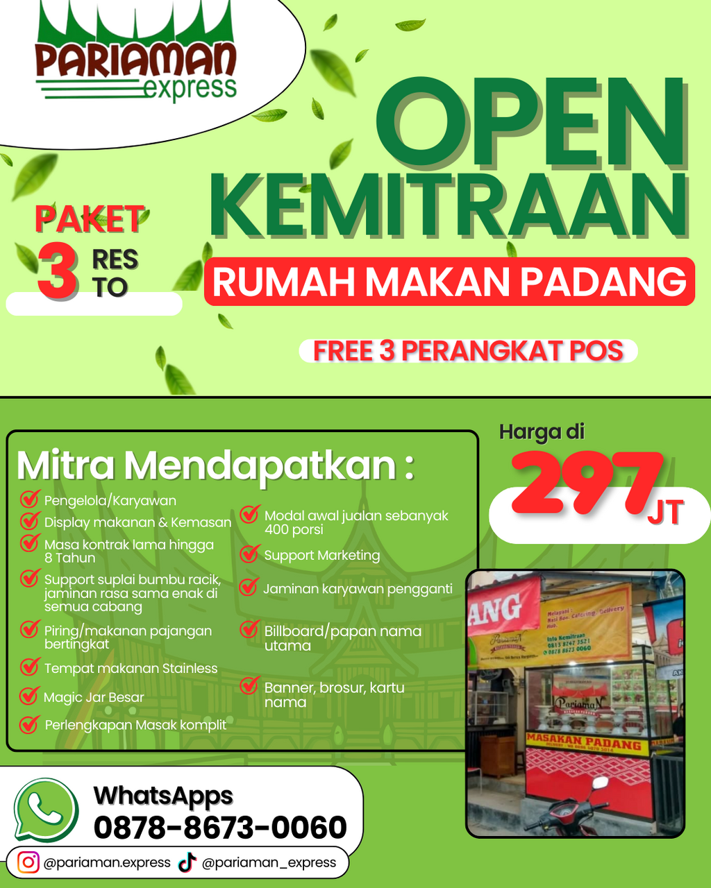 Paket Resto adalah solusi sempurna untuk memulai usaha kuliner dengan konsep rumah makan Padang yang sukses. Ideal untuk lokasi strategis, paket ini mencakup desain restoran, bumbu racik, dan dukungan operasional.